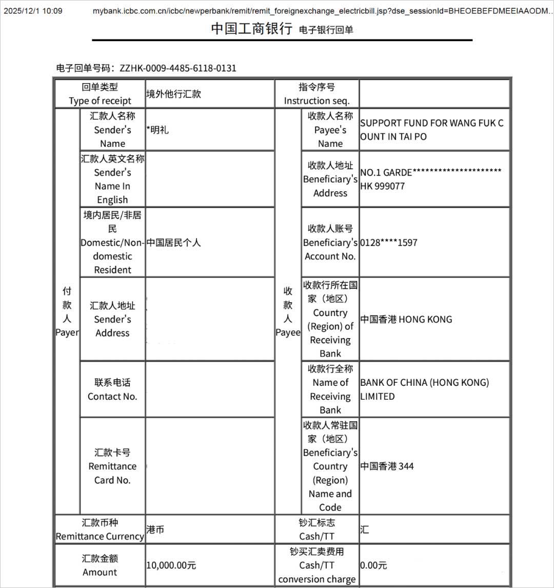 - 公司创始人喻明礼先生个人捐款:港币 10,000 元